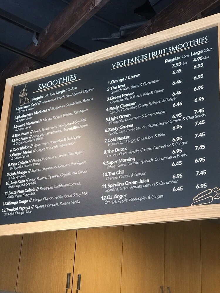 Shot of espresso, organic raw cacao, almond butter, bananas, vanilla almond milk, chocolate whey protein and organic raw cacao.